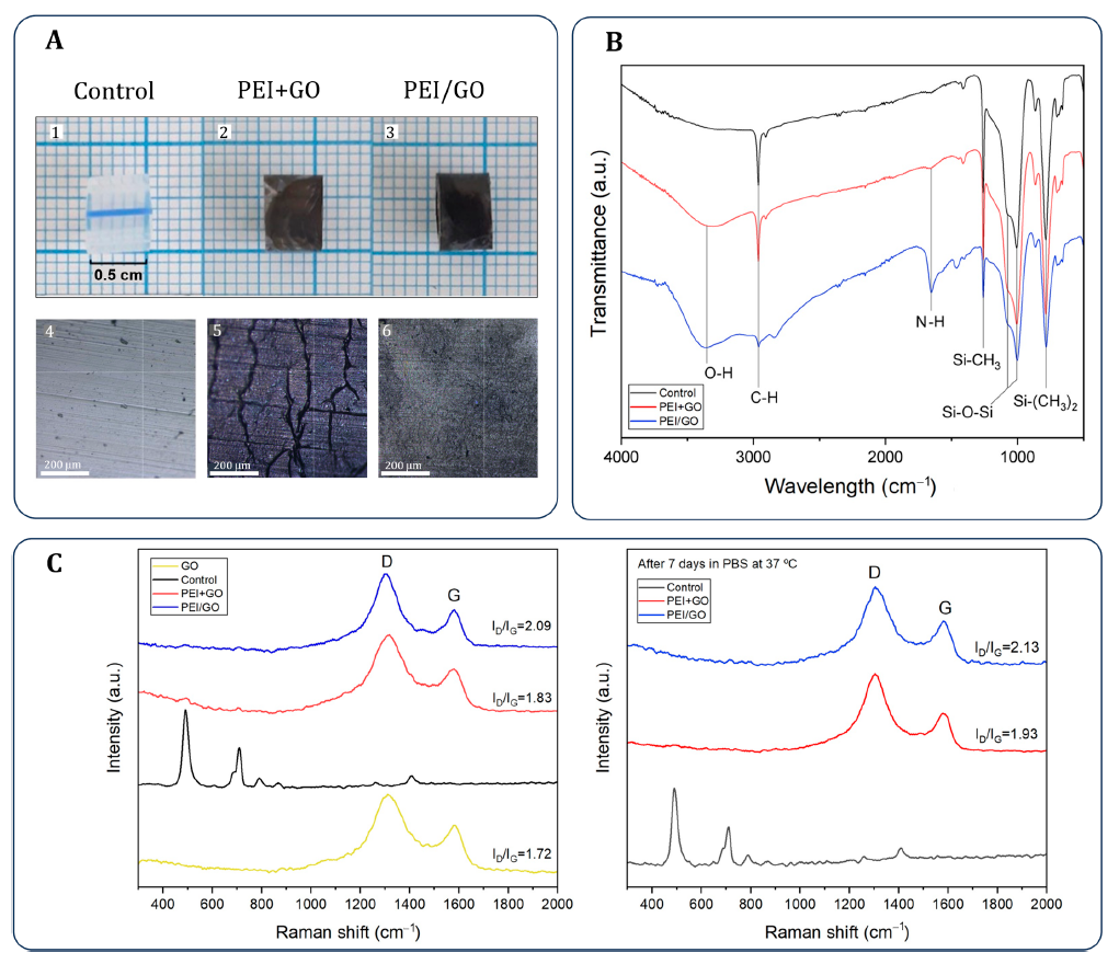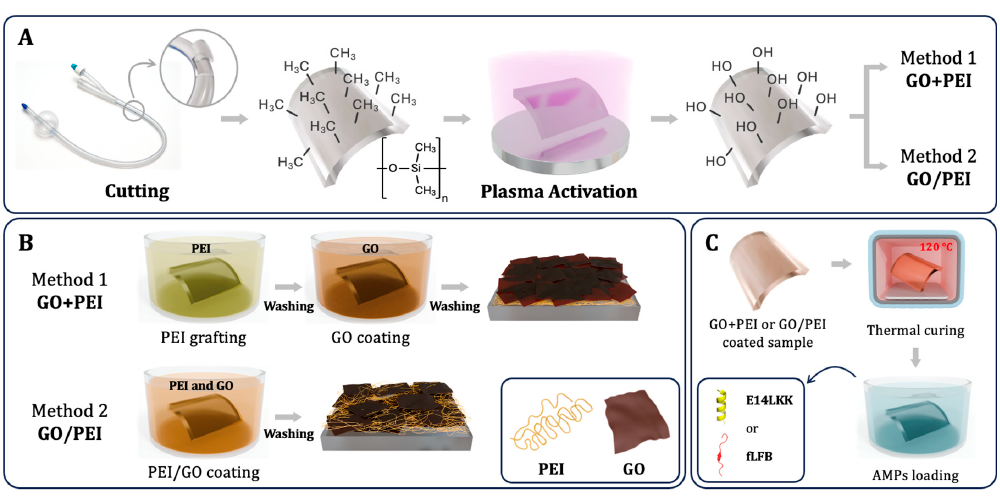 The study’s conclusion is that coating configuration and GO–AMP interaction strength together dictated antimicrobial performance on urinary catheters. In the tested set, PEI+GO outperformed PEI/GO in antibacterial activity.