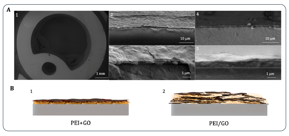 Cross-sectional SEM in Figure 4 shows the layered PEI+GO structure and the embedded PEI/GO structure, giving the physical context for the surface-property differences measured in Figure 3.