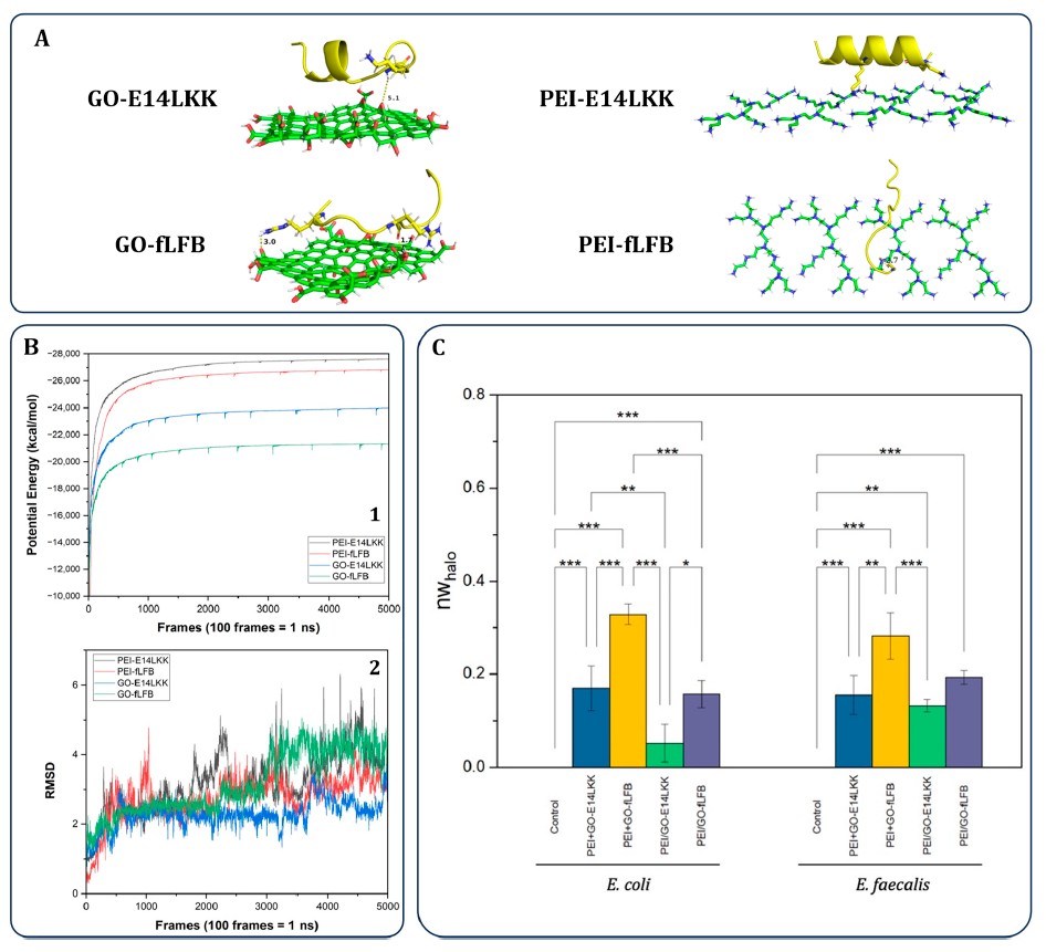The study paired wettability with zeta potential, surface roughness, FTIR, Raman spectroscopy, optical microscopy, VP-SEM, and FEG-SEM to characterize the two coating architectures. Molecular dynamics simulations tracked potential energy and RMSD for GO–peptide and PEI–peptide complexes, and agar diffusion assays against E. coli and E. faecalis were used as a comparative indicator of peptide release from the coatings.