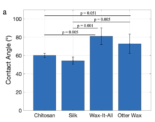Applying Wax-It-All increased the contact angle of the Shrilk film by 35% relative to the untreated chitosan layer (p = 0.005) and 50% relative to the untreated silk layer (p = 0.001). Otter Wax increased contact angle by 21% relative to the untreated chitosan layer (p = 0.051) and 34% relative to the untreated silk layer (p = 0.014), and the reported mean contact angles for Wax-It-All- and Otter Wax-treated films were 81° and 73°, respectively.