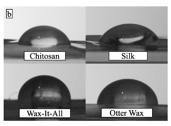Representative droplet images on chitosan, silk, Wax-It-All, and Otter Wax surfaces provide a visual comparison of how coating changed wetting behavior.