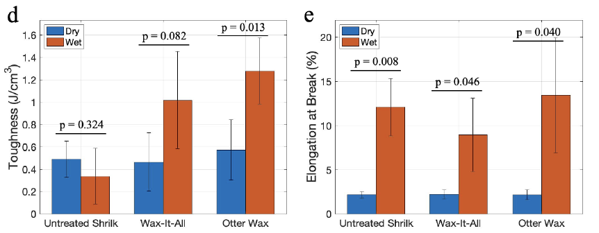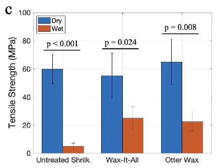 Untreated Shrilk films lost more than a factor of 10 in tensile strength when wet (p < 0.001). Wax-It-All- and Otter Wax-treated films dropped by factors of 2.46 (p = 0.024) and 2.89 (p = 0.008), respectively.