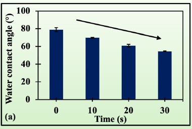 This panel shows the optimized ALE film’s water contact angle decreasing from 78.9 ± 2.3° at 0 s to 54.5 ± 0.4° at 30 s.