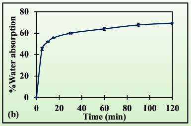 This panel shows water absorption increasing over time to 69.3 ± 1.0% at 120 min, providing hydration context alongside the Dropometer-derived wetting data.