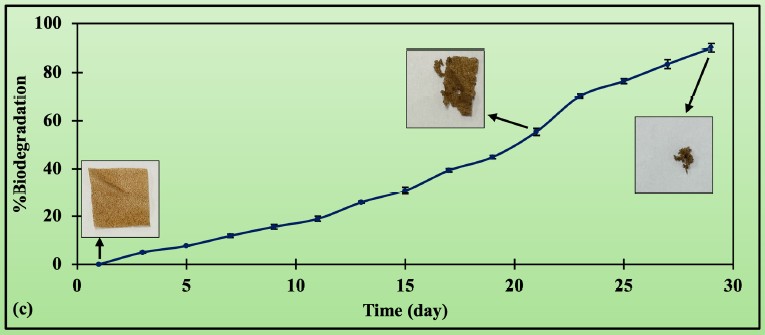 This panel shows soil biodegradation progressing beyond 90% by day 29, connecting the film’s surface and hydration behavior to its biodegradable packaging use case.