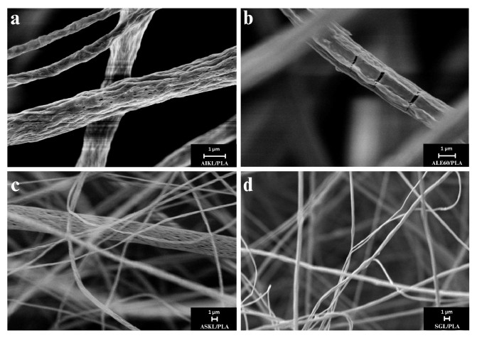 Figure 6 provides SEM views of AIKL/PLA, ALE60/PLA, ASKL/PLA, and SGL/PLA, which the authors use alongside contact-angle results when discussing surface roughness, rigidity, and hydrophobic behavior.