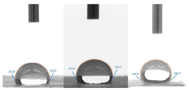 The paper states that water contact angle was measured using the “Droplet Lab smartphone-based tensiometer (Toronto, ON, Canada)” with the Sessile drop method, and contact angle was calculated using Young–Laplace fitting.